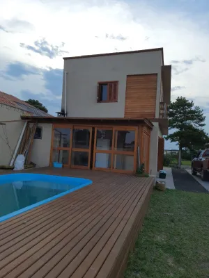 Sobrado perto do mar, composto por 3 dormitórios, sendo um demi suíte, sala estar e jantar, cozinha, banheiro social, garagem , churrasqueira, semi mobiliado, laje de concreto e forro de madeira, venha conhecer esse imóvel.